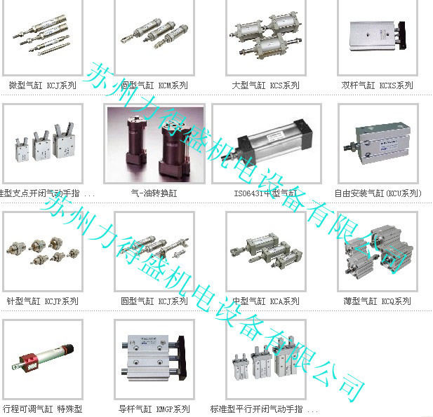 二、气动执行元件(气缸):标准型KCJ1,KCJ2,KCM2,KCA,KSI,KSU无拉杆型,KSC,KCS1,系列、针型气缸KCJP,KCDJP系列;迷你型铝合金气缸:KMAL系列;薄型气缸KCQ2,KSA系列;自由安装型KCU,KCUJ系列;双轴气缸:KCXS,KTN系列;新薄型带导杆气缸:KMGP,KAMR系列:平行开闭气爪HQZ系列;支点开闭气爪HQC系列;磁性开关:I-C73K/I-A54K/I-A73K/I-A93K/DX-32/CS1-J;油压吸震器UPA/SCA系列;精密稳速器CSC系列;